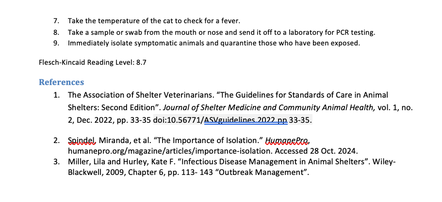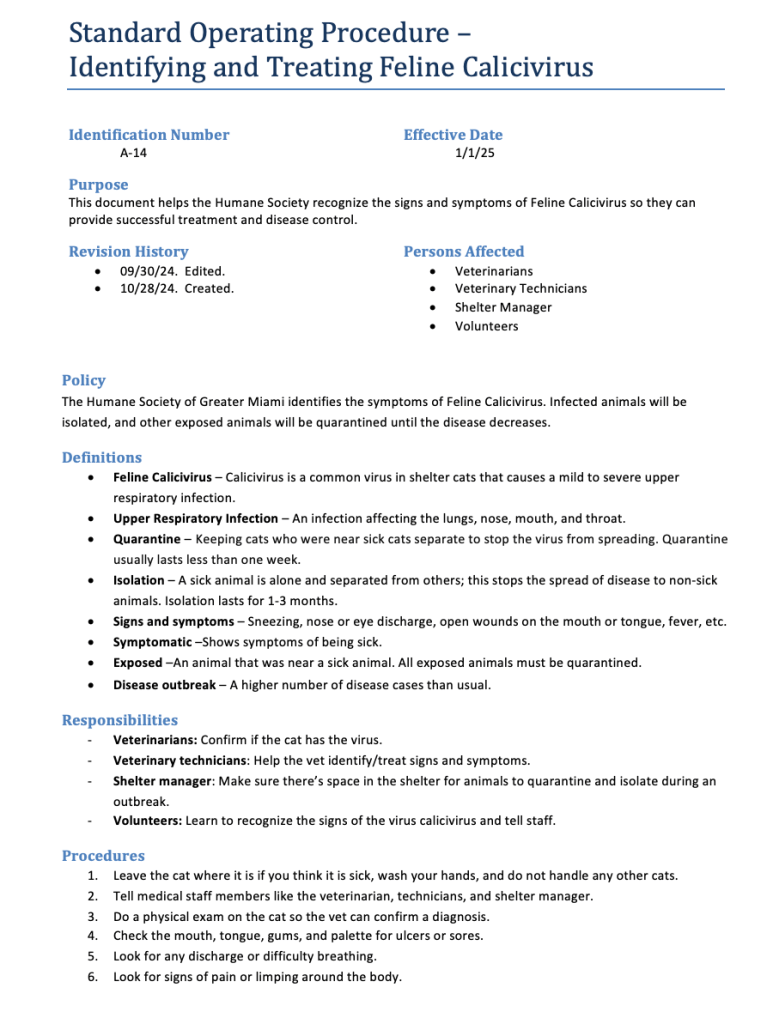 An SOP is a document that outlines the recognition, treatment protocol, and aftercare for a specific problem present in the shelter. I determined my SOP topic to be recognizing and treating Feline Calicivirus. My SOP outlined the signs & symptoms present with Calicivirus, how to properly treat it, and how to prevent disease outbreak in the shelter:
